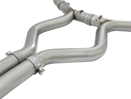 This cat-back exhaust system is constructed of 2-1/2 IN mandrel-bent 304 stainless steel tubing for maximum strength and durability. Finishing off this exhaust system are dual 4-1/2 IN diameter polished 304 stainless steel clamp-on exhaust tips. The tips features a laser etched aFe POWER logo for a unique style. This system features high-flow 409 stainless steel polished mufflers, producing an aggressive sound. Muffler finish may vary. This system produces a deep sound unleashing all available horsepower and torque. Designed to equalize and evenly distribute exhaust pulses reducing drone, improving sound. Utilizing factory style flanges and hangers this system is a direct bolt-on system, which requires no cutting or modifications for a hassle-free installation. A mitered merge x-pipe is used to balance and evenly distribute exhaust pulses traveling through the exhaust system, minimizing exhaust drone and maximizing scavenging. State-of-the-art computer-aided design technology is utilized for precise vehicle fitment. 100% MIG-Welded for race-proven strength and durability.