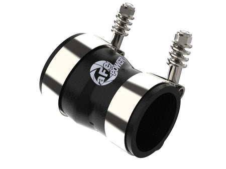 This oversized 2-1/4in OD Turbo Muffler Delete replaces the factory turbo muffler located between the turbo compressor outlet and the hot side charge pipe. The straight through oversized design tremendously increases flow and turbocharger sound by creating a smooth transition between the turbo and intercooler tube. CNC machined from 6061-T6 aluminum then finished in red anodizing also provides superior strength and long lasting durability. This turbo muffler delete kit includes high-quality, stainless-steel, spring-loaded T-bolt clamps and a heavy-duty, 5-ply, polyester reinforced silicone coupling for superior strength and durability. Finished with Red Anodizing and a unique laser-etched aFe Power logo for a custom look. Designed to work with the OE charge pipes only. Will not work with aFe charge pipes (46-20414-B ).