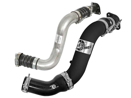 Flow and Performance: Constructed of mandrel bent, powder-coated aluminum tubing for maximum flow. The smooth transition bends decrease turbulence and minimize pressure loss, increasing horsepower, torque and lowering EGT's. Perfect Fit: Utilizes the factory mounting locations to provide stability for a hassle-free installation. Includes high quality stainless steel spring loaded t-bolt clamps and heavy-duty 5-Ply couplings for strength. Fits OEM or aFe's upgraded intercooler (46-20281). aFe Badging: A unique laser-cut aFe power logo plate is welded-on for an aggressive style.