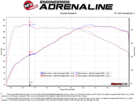 Performance Gains: This system produced gains of up to +11 HP and +15 lbs. x Ft. TQ., as measured on our in-house dyno.3" - 2-1/2" 304 Stainless Steel Construction: This axle-back exhaust system is constructed of 3" - 2-1/2" mandrel-bent 304 stainless steel tubing for maximum strength and durability.High-Flow Stainless Steel Black Muffler: This system features a high-flow stainless steel black muffler, producing a mild sound. The muffler has a black finish for ultimate corrosion resistance.Dual 4" Diameter Black Exhaust Tips: Finishing off this exhaust system are dual 4" diameter black 304 stainless steel clamp-on exhaust tips. The tips features a laser etched aFe POWER logo for a unique style.Installation: Utilizing factory style hangers this system mounts directly to factory mounting locations for a hassle-free installation. Some cutting required.Exhaust Valve: This axle-back exhaust system incorporates a factory style exhaust valve which uses the factory exhaust valve motors (not included). The valve helps regulate, direct and control the flow of exhaust gases by opening, closing, or partially obstructing passageways depending on throttle position for maximum performance.Integrated Mitered Merge Collector: A mitered merge collector is used to decrease turbulence and increase exhaust velocity resulting in increased horsepower, torque and improved throttle response.Computer-Aided Design: Utilizing state-of-the-art computer-aided design technology, this exhaust system is designed for custom, high tolerance factory fitment.MIG-Welded: 100% MIG-Welded for race-proven strength and durability.Emissions Disclaimer: This product does not require a CARB EO#.aFe POWER exhaust systems are engineered and manufactured in our Corona, California facility.