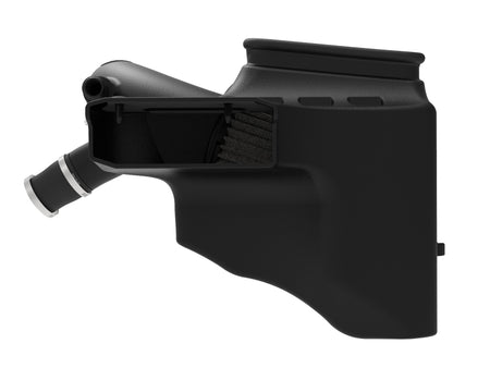 This aFe POWER Pro DRY S is a 7-1/2†tall, oil-free, 360-degree radial flow performance air filter with three layers of synthetic media for maximum convenience. Its progressive layering provides great filtration efficiency and dust holding capacity, while not requiring the use of oils. This media is best suited for street and light off-road use. Its inverted top makes for more filter surface area, resulting in more flow and longer service intervals. The included massive air filter is surrounded by an open-element XLPE (cross-linked polyethylene) polymer housing that minimizes warm engine air for maximum performance. Its open design allows for easy viewing of the air filter, yet creates a heat-blocking seal when the vehicle's hood is closed. It features a built-in ram air scoop that captures additional cool air from behind the front grille. This system features a high quality, CAD-designed, dyno-tuned intake tube to achieve maximum power gains while maintaining a perfect fit. Its XLPE material is heat soak resistant, extremely durable, and features a Takeda design inspired by import vehicles. The system is CAD-designed and utilizes factory mounting locations – making for a hassle-free, direct bolt-on installation process that requires no cutting or drilling on OEM parts. Its revolutionary design, featuring our patent pending filter-to-housing interface, uses half the number of parts of a traditional cold air intake system. An included billet aluminum fitting allows OE connections to transfer over seamlessly.