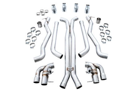 The SwitchPath™ Cat Back Exhaust features dual 3†CNC mandrel-bent .065†wall T304L stainless steel tubing from downpipes to tip outlets with a precision-engineered X-pipe in between. Equipped with valved rear sections, the SwitchPath™ Cat Back retains all of the M5’s valve behavior when changing driving modes and/or using the exhaust button found on the console. The AWE Performance Mid Pipes replace the factory mid section with a 3†stainless steel X-pipe, and are included in the Cat Back SwitchPath™ configuration. All tip options are 4", slash-cut, and include the AWE logo and double-walling to ensure a mirror finish even under hard usage. All tips are individually adjustable, allowing depth into the bumper to be set according to personal taste.