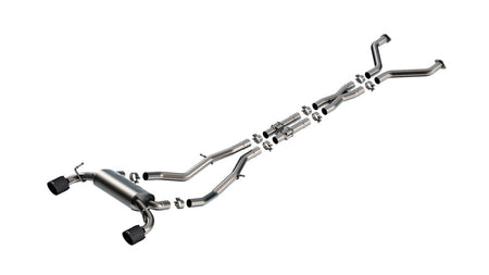 This system is a True Dual design that features a Merge X-Pipe and Polyphonic harmonizer technolgy. All of these features combine to provide the classic S-Type sound level and the BORLA no drone guarantee. The Merge X-Pipe blends the combustion pulses from both sides of the engine for improved performance and a custom sound. BORLA'S Polyphonic Harmonizer Technology utilizes patented units that contain pipes of different diameters and lengths to create multiple exhaust notes that harmonize to deliver a clean, rich, full-bodied sound. 4.5" carbon fiber with black anodized center tips provide a custom appearance. Systems with polished phantom style T-304 stainless steel tips are also available. BORLA Cat-Back & Axle-Back exhaust systems feature patented straight-through and multi-core technology to unleash hidden horsepower. Increased exhaust velocity adds power, driving excitement, fuel economy, and the distinctive BORLA Sound of Power respected by motoring enthusiasts everywhere. Each system is built from premium, high-quality T-304 austenitic stainless steel, superior to T-400 series knockoffs (such as 409), to give you the absolute best in performance and durability. Ultra-smooth mandrel bends ensure maximum flow & power, and precision computer numerical control (CNC) manufacturing ensures an accurate fit. Best of all, BORLA stands behind every system with a Million-Mile Warranty. Just what you?d expect from the world?s most experienced (and most winning) exhaust brand. System Features: Cat-Back Exhaust System 2.5" True Dual Design S-Type Sound Level No Drone Merge X-Pipe Polyphonic Harmonizer Dual 4.5" Carbon Fiber With Black Anodized Center Tips T-304 Stainless Steel Million-Mile Warranty