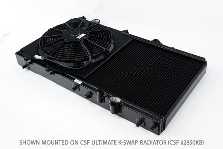 This optional all-aluminum fan shroud with 12" high-performance SPAL Fan is the perfect pairing for the CSF Ultimate K-Swap Radiators (CSF #8250K/8250KB). Made from high quality laser cut aluminum, the CSF Fan & Shroud kit keeps your K-Swapped Civic/Integra perfectly cool in style. The CSF #2858FB comes in a Black Finish for a high-end stealth look to match the CSF #8250KB. Also available in a Polished Finish (CSF #2858F) to match the CSF #2850K.