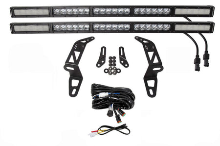 FeaturesDirect fitment on 2018-2024 Jeep Wrangler.CAD-designed for perfect fitment and OEM-like appearance.Highly durable powdercoated steel construction.Utilizes existing mounting points and hardware for a simple installation.Control through factory aux switch bank using the included harness. OverviewPerfect Fitment. The Bumper LED Light Bar Kit compatible with Jeep Wrangler 2018-2024 from Diode Dynamics allows you to mount either a single SS30 Stage Series 30 LED Light Bar or dual Stage Series 30" LED Light Bars on the factory front bumper. These application-specific brackets were CAD-designed to install using factory mounting points. No cutting or drilling required!Choose your look. This kit can be mounted in different ways to achieve the look you're after! Mount a single light bar using the base brackets or use the included extension brackets to allow clearance for a winch or mount a second light bar for maximum light output. The brackets without the light bars or harnesses are available separately and are compatible with any generic 30" LED light bar.Control through aux switch bank. Included with the kit is our new OEM Auxiliary Switch Dual-Output Wiring Harness. This harness allows you to control your LED light bars using the factory-installed aux switch bank. For those who don't have the aux switch bank our Heavy Duty Dual/Single-Output Wiring Harness is also included.What's IncludedTwo (2) Application-specific heavy duty steel brackets for installation on 2018-2023 Jeep WranglerTwo (2) Extension bracketsOne (1) or Two (2) SS30 Stage Series 30" Light BarsOne (1) Aux Switch Adapter WireOne (1) Heavy Duty Dual-Output Harness or One (1) Heavy Duty Single-Output HarnessAll Necessary HardwareInstallation Guide"