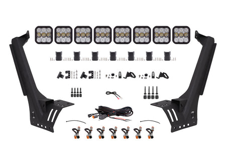 FeaturesBolt-on fitment compatible with Jeep JL Wrangler 2018-2021Ultra-high intensity with custom-engineered TIR opticsSelectable backlight color with eight color optionsTorture-tested heavy-duty constructionControl through factory aux switch bank using the included harnessAssembled in USAOverviewPerfect Fitment. The Windshield CrossLink Lightbar Kit compatible with Jeep JL Wrangler 2018-2021 from Diode Dynamics allows you to mount eight linked SS5 LED pods above the factory windshield. These application-specific brackets were CAD-designed to bolt into place using factory mounting points above the factory windshield. No cutting or drilling required!Designed for Performance. Featuring the highest output intensity of any 5-inch LED pod on the market these lamps have been designed for maximum functionality with patented technology and custom-engineered TIR optics all in a durable package.Selectable Backlight. The SS5 LED Pods included in the White kit feature a selectable backlight with eight different color options perfect for extra styling or for more visibility when you(TM) re not using the main beam. Selecting your backlight color is easy - simply alternate the power on and off. There(TM) s no complicated programming with a controller! The SS5's backlight fully illuminates the TIR optic providing unique accent lighting that you won't find on other LED pods. NOTE: Due to the yellow lens the Yellow kit is only available with an Amber backlight.CrossLink. Our patent-pending CrossLink technology allows you to link up to eight SS5 pods together to create your own lightbar. The single-piece CNC aluminum link provides extreme rigidity but is fully adjustable for both straight and curved configurations.