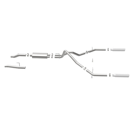 The MagnaFlow Street Series Cat-Back Performance Exhaust System 16520 brings out the personality of your Truck with our signature resonant, powerful engine tone and dyno-proven performance. Thanks to its fast-flowing, mandrel bent 3in. main piping and 1 Straight-Through mufflers ending in a Dual Split Rear exit with 3.5in. Polished Clamp-On Single Wall Angle Cut Rolled Edge tips, this Truck exhaust kit has the performance chops to match its sporty sound and appearance. Upgrade your ride to the next level with an exhaust that has the pipes to put other Truck's to shame. With this system your vehicle will be producing Aggressive exterior and Moderate interior sound levels while leaving other cars and trucks feeling envious at every stoplight. Exhaust kit 16520 features a cat-back layout that replaces your ride's stock exhaust components from near the catalytic converter on back. Extensive 3D scanning during development has resulted in a direct-fit design that you can easily install yourself. 16520 is produced using CNC precision robotic manufacturing techniques and is backed by MagnaFlow's 1-year limited finish warranty and limited lifetime construction warranty.