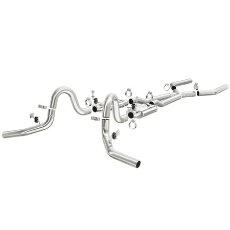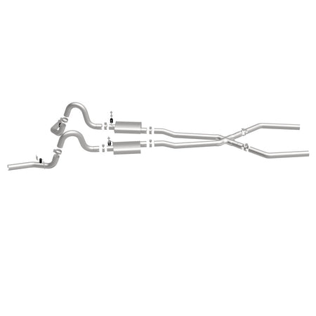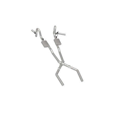 The MagnaFlow Street Series Crossmember-Back Performance Exhaust System 15897 brings enhanced engine sound and dyno-proven performance to your muscle car with a healthy helping of our deep, resonant signature exhaust note at Aggressive exterior and Moderate interior sound levels. Thanks to its durable, corrosion resistant stainless steel design, this exhaust system will handle whatever tarmac you decide to leave your mark on. This performance exhaust kit features a crossmember-back layout designed to replace your exhaust system from the crossmember on back. With its fast-flowing, mandrel bent 3in. main piping and 2 Straight-Through mufflers ending in a Dual Split Rear Behind Rear Tires exit that you can enhance with tips of your choosing, your muscle car will be sounding as awesome as it looks. Extensive 3D scanning during development has resulted in a direct-fit design that you can easily install yourself. 15897 is produced using CNC precision robotic manufacturing techniques and is backed by MagnaFlow's limited lifetime construction warranty.