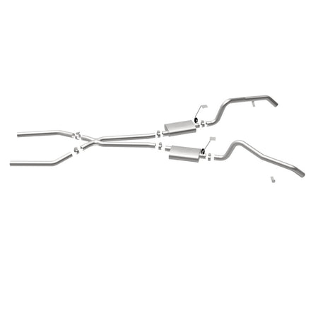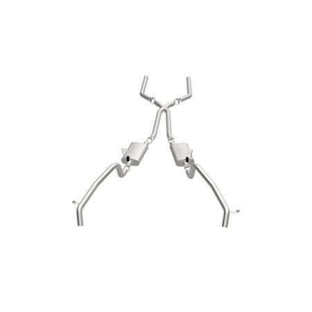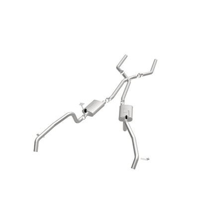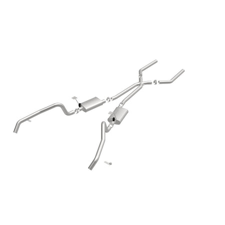 The MagnaFlow Street Series Crossmember-Back Performance Exhaust System 15896 brings enhanced engine sound and dyno-proven performance to your muscle car with a healthy helping of our deep, resonant signature exhaust note at Moderate exterior and Mild interior sound levels. Thanks to its durable, corrosion resistant stainless steel design, this exhaust system will handle whatever tarmac you decide to leave your mark on. This performance exhaust kit features a crossmember-back layout designed to replace your exhaust system from the crossmember on back. With its fast-flowing, mandrel bent 2.5in. main piping and 2 Straight-Through mufflers ending in a Dual Split Rear exit that you can enhance with tips of your choosing, your muscle car will be sounding as awesome as it looks. Extensive 3D scanning during development has resulted in a direct-fit design that you can easily install yourself. 15896 is produced using CNC precision robotic manufacturing techniques and is backed by MagnaFlow's limited lifetime construction warranty.