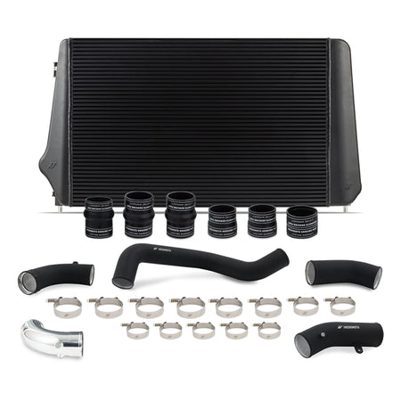 Built to handle heavy payloads, provide impressive performance, and execute years of reliable service, the 2017-2019 6.6L Duramax L5P is an absolute workhorse. However, as with any factory vehicle, some systems have limitations and areas that can be improved. Our engineering team has specifically identified the L5P's intercooler system as one of these areas. As a result, we've developed a performance intercooler kit for the 2017-2019 Chevrolet/GMC 6.6L Duramax L5P.This kit includes a massive 68mm-thick bar-and-plate intercooler with cast-aluminum end tanks and 3.0in mandrel-bent piping for maximum cooling and flow. Our intercooler is 70-percent thicker than stock and is designed to be a robust unit capable of withstanding high temperatures and boost pressures without cracking. In addition, our end tanks also feature larger inlets and outlets for even more flow. That, coupled with the larger intercooler core, reduces restriction by over 64-percent compared to the stock intercooler.Our kit also includes hot-side and cold-side intercooler piping with DuraCoreâ„¢ boots and constant-tension T-bolt clamps. Our 3.0in mandrel-bent aluminum piping eliminates the restrictive stock resonator and improves flow by up to 55-percent over stock. The Mishimoto L5P Duramax intercooler pipes fit like stock thanks to the included CNC-machined quick-disconnect fitting with new O-rings and spring clip, bead-rolled pipe ends, and mounting locations for factory sensors and harnesses. Our pipes also include three bungs that can be drilled and tapped for sensors or water/meth injection.The Mishimoto 6.6L Duramax L5P Performance Intercooler Kit is a direct fit for your 2017-2019 Chevrolet or GMC HD truck and is a fantastic upgrade for both stock and heavily modified trucks. Like all our Duramax performance parts, this L5P intercooler kit is protected by our signature Mishimoto Lifetime Warranty.