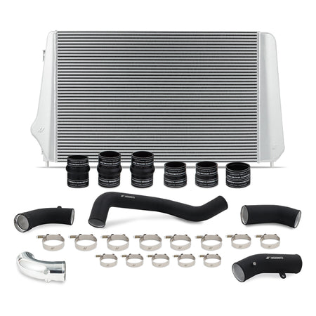 Built to handle heavy payloads, provide impressive performance, and execute years of reliable service, the 2017-2019 6.6L Duramax L5P is an absolute workhorse. However, as with any factory vehicle, some systems have limitations and areas that can be improved. Our engineering team has specifically identified the L5P's intercooler system as one of these areas. As a result, we've developed a performance intercooler kit for the 2017-2019 Chevrolet/GMC 6.6L Duramax L5P.This kit includes a massive 68mm-thick bar-and-plate intercooler with cast-aluminum end tanks and 3.0in mandrel-bent piping for maximum cooling and flow. Our intercooler is 70-percent thicker than stock and is designed to be a robust unit capable of withstanding high temperatures and boost pressures without cracking. In addition, our end tanks also feature larger inlets and outlets for even more flow. That, coupled with the larger intercooler core, reduces restriction by over 64-percent compared to the stock intercooler.Our kit also includes hot-side and cold-side intercooler piping with DuraCoreâ„¢ boots and constant-tension T-bolt clamps. Our 3.0in mandrel-bent aluminum piping eliminates the restrictive stock resonator and improves flow by up to 55-percent over stock. The Mishimoto L5P Duramax intercooler pipes fit like stock thanks to the included CNC-machined quick-disconnect fitting with new O-rings and spring clip, bead-rolled pipe ends, and mounting locations for factory sensors and harnesses. Our pipes also include three bungs that can be drilled and tapped for sensors or water/meth injection.The Mishimoto 6.6L Duramax L5P Performance Intercooler Kit is a direct fit for your 2017-2019 Chevrolet or GMC HD truck and is a fantastic upgrade for both stock and heavily modified trucks. Like all our Duramax performance parts, this L5P intercooler kit is protected by our signature Mishimoto Lifetime Warranty.