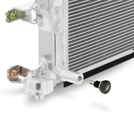 The 2023+ Toyota GR Corolla churns out 300 horsepower from just 3 cylinders and 1.6L of displacement. Each cylinder is running at the limit, and your GRC's cooling system has a lot of work to do to keep up. Long battles on the track or sitting in traffic can easily overwhelm the stock cooling system, and some owners have seen oil temps over 260 degrees on track. The stock oil cooler on the GRC is a liquid-to-liquid design that relies on coolant temperatures to maintain safe oil temps. If your radiator can't keep up, it's only a matter of time before your oil can't either. That's why Mishimoto has developed a performance aluminum radiator to keep every aspect of your GR Corolla's engine cool.----This all-aluminum radiator replaces the stock plastic end tank unit with a core that is 51 percent larger. That increase in core volume means your cooling system can hold more coolant and dissipate more heat, placing less stress on the cooling system overall. Inside the core, we've focused on utilizing the entire cooling area with strutted tubes and louvered fins. Strutted tubes allow us to use a single, wider tube, that has greater effective area than multi-row cores. These strutted tubes also significantly improve core rigidity to help prevent leaks from impacts like potholes or running off track. Louvered external fins circulate air throughout the core to transfer more heat. Finally, the included foam shrouding ensures cool air goes through the core, not just around it.----In addition to performance, we've also thought about durability and serviceability. Our radiator features reinforced intercooler mounts, so you can add a larger intercooler (like Mishimoto's) without worrying about the mounts breaking. To help service your new radiator, we've designed an extended drain port with a slotted drain plug, to keep draining mess-free. Of course, this 2023+ GR Corolla performance radiator is also backed by our Mishimoto Lifetime Warranty for a lifetime of performance.