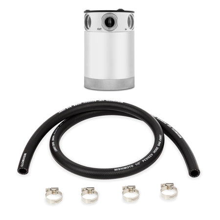 Mishimoto is proud to announce the release of our Compact Baffled Oil Catch Can, available in a two-port or three-port option. With years of oil catch can research and development time, Mishimoto has created the most effective compact oil catch can on the market. The Mishimoto Compact Baffled Oil Catch Can was designed to separate oil particles from the PCV/CCV air that would normally have just been routed back to your intake. The internal air diverter turbulates the air longer and ensures all the oil sinks to the bottom of the can, leaving nothing but clean air to pass through the 50 micron bronze filter to the intake. An internal baffle keeps the collected oil from splashing around under race conditions. This oil catch can features two ports, one inlet and one outlet, for easy installation on CCV and PCV systems. The 100-percent billet, 6061 aluminum can features 3/8in NPT threads at the inlet, outlet, and drain area and includes two black nylon fittings to make installation effortless. For maximum fitment options, the top mounting setup allows the can to be mounted from multiple angles. To make maintenance easy, the drain plug can be removed to allow for a return to the oil pan. The can is also 100-percent washable, unlike many other cans that require you to replace your filtration system.Our catch cans are different from most air-oil-separator (AOS) systems on a few levels. First, our catch cans are not heated. This means that all of the blow-by is able to condense in the can, including low-octane oil vapors and contaminated fuel vapors. Most AOS systems also drain the blow-by back into the oil pan, while our catch cans trap the blow-by and keep it out of the engine permanently. If you've seen what We've seen in the bottom of our catch cans, you won't want that draining back into your oil either.